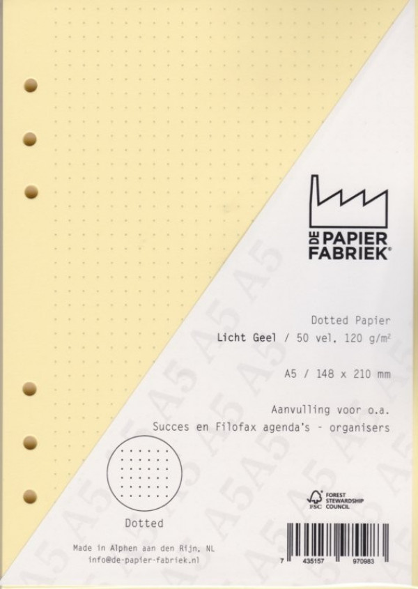 A5 Filling notes paper for example for: Succes, Filofax and Kalpa Calendars/Planners - A5 Size - 50 sheets (100 pages) - Dotted Light Yellow coloured Paper - 120 g/m2. Price is per 50 sheets