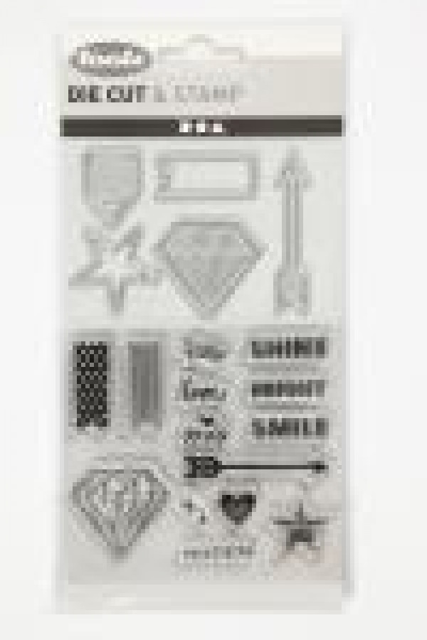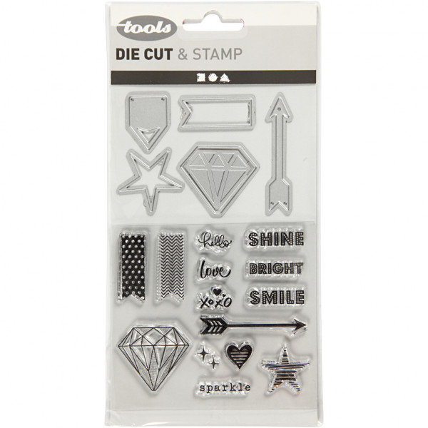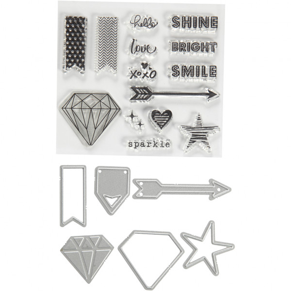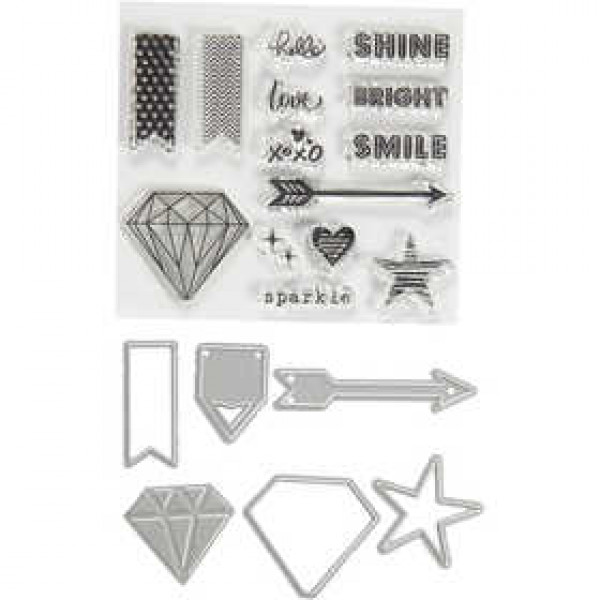 Contents: 14 stamps, 1 embossing template and 6 die cuts.