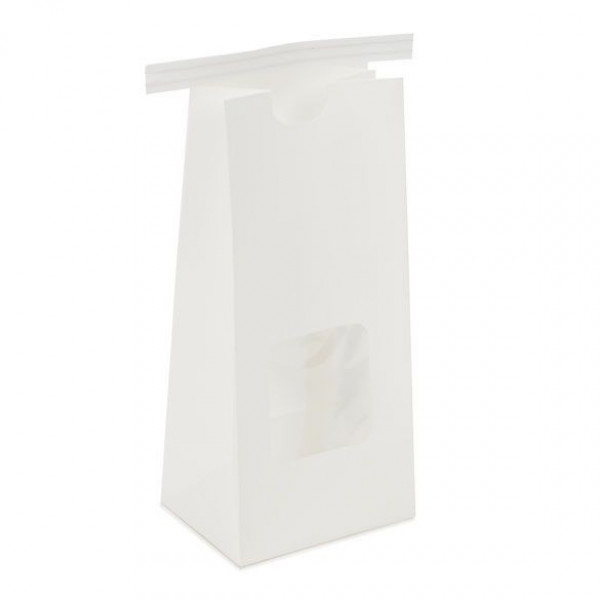 Pack Quantity: 100Color: WhiteMaterial: Paper 80g/OPP 30/PETOuter Dimensions: 108 x 64 x 267 mmInner Dimensions: 76 x 89 mmClosure: Tin Tie ClosureFood Safe: Yes