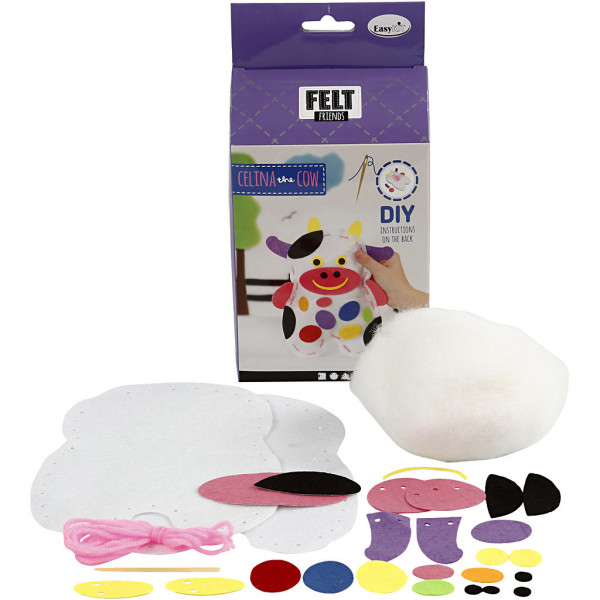 Content: 1 figure cut out of polyester felt with associated adhesive felt ornaments, stuffing, yarn and needle for sewing. Instructions on the package.