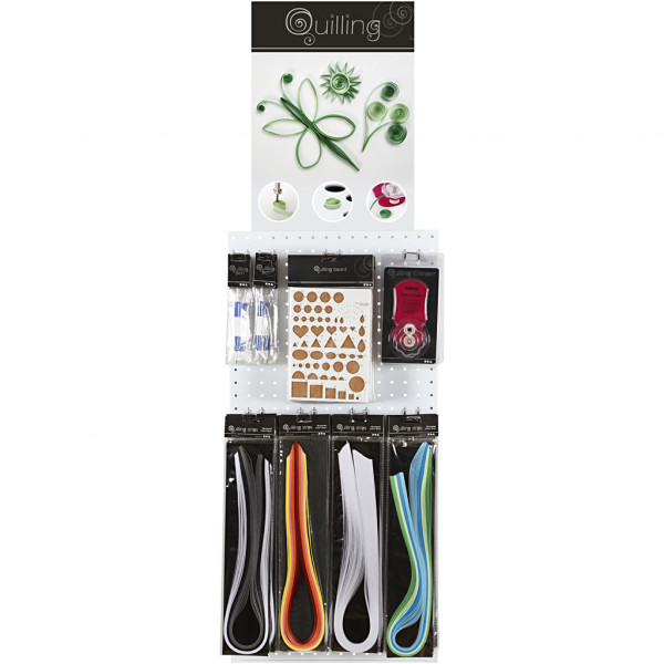 Contains 10 quilling boards, 20 quilling pens, 40 assorted pack of quilling paper strips, and 2 qulling crimpers.
