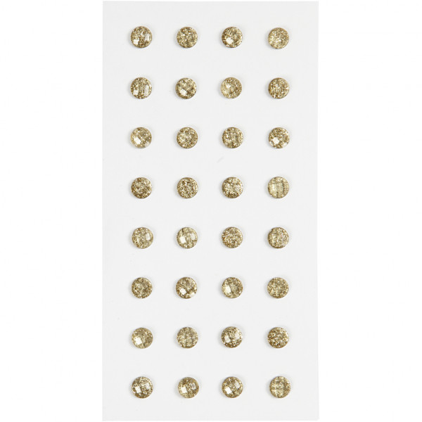 Self-adhesive, round rhinestones with glitter surface.