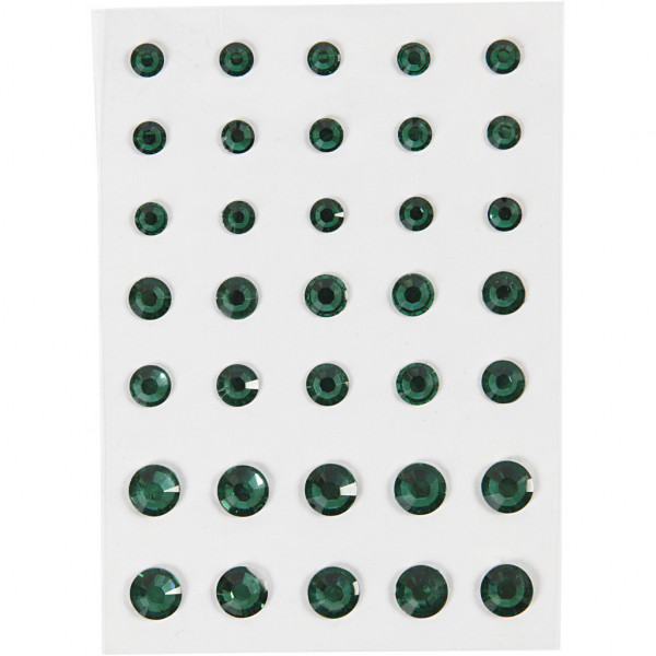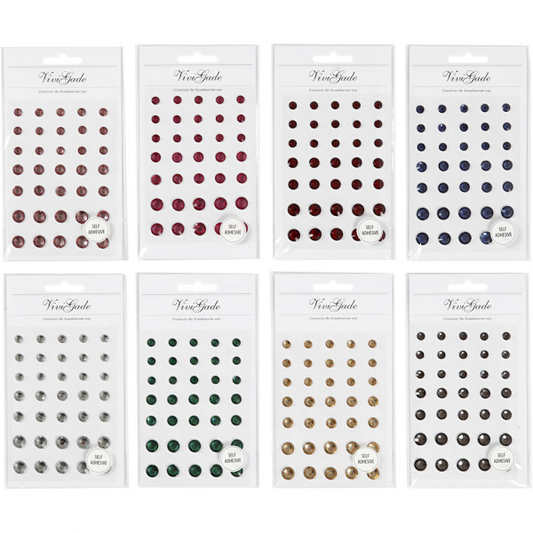 An assortment of self-adhesive rhinestones in a design from Vivi Gade with a facet lace front and a flat back in 3 sizes (round cone).