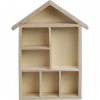House shaped shelving system of light wood with metal bracket and 7 compartments.