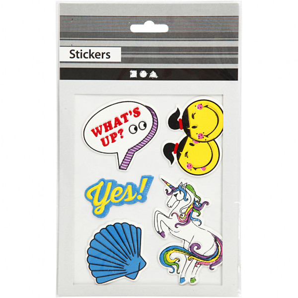 Self-adhesive stickers made of plastic, printed with colourful motifs. Used for decoration on bags, mobile covers and shoes.
