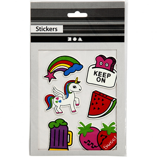 Self-adhesive stickers made of plastic, printed with colourful motifs. Used for decoration on bags, mobile covers and shoes.