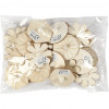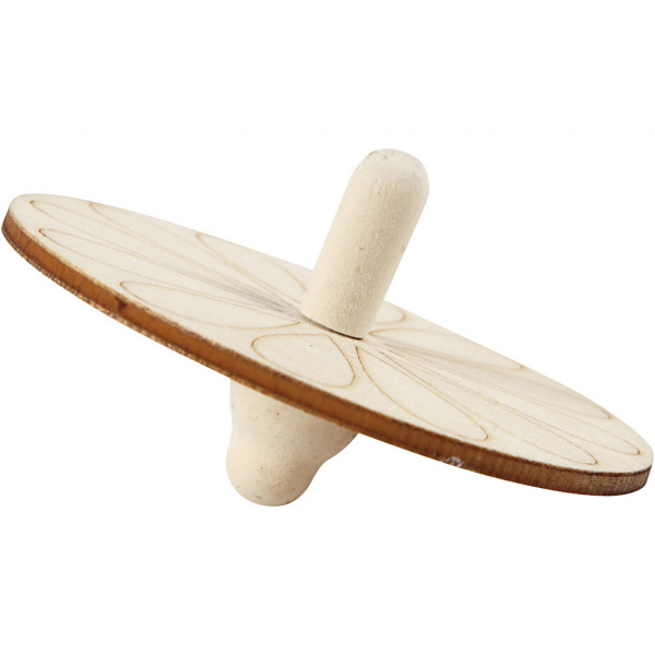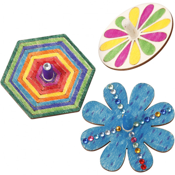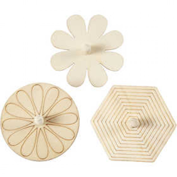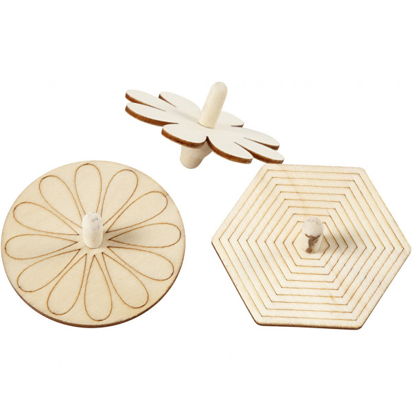 Spinning Tops in 3 different designs (round, 6-edged flower) of light wood. The round and 6-sided spinning tops have detail on the top, to paint.