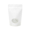 Stand up pouches with oval windows are a great way to get your product noticed on store shelves. The ZBGO3P bag has outer dimensions of 130 x 80 x 205 mm and is pearl in color for a refreshing look. Package nuts, coffee, rice, bath salts, powdered mixes, and more. The self-supporting design of this pouch has a usable space of 121 x 64 x 171 mm and holds 113 g (based on whole coffee beans). The material is a sturdy 120 micron and is laminated for extra strength and barrier to keep your products fresh. A reclosable zipper allows your customers resealing convenience. Tear notches offer easy access once heat sealed.