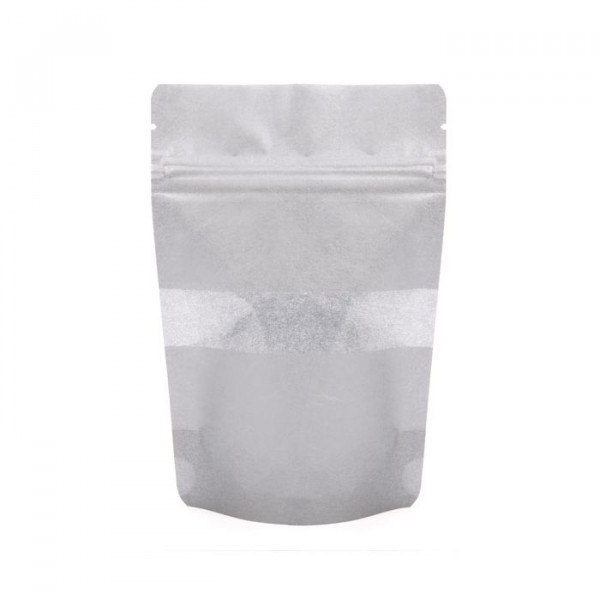 Measuring 102x60x152mm, this rice paper pouch is ideal for packaging non-refrigerated items like candies, salts, sprinkle mixes and more. Stand Up Zipper Pouches feature a self-supporting pouch design that makes them perfect for retailer's shelves. The fiber pattern on this shiny silver bag gives it an earthy feel, while providing a more upscale look than a traditional paper pouch. ZBGR2S has usable space that measures 90 x 50 x 120mm and holds 57 g of dry goods (based on whole coffee beans). The resealable zipper will help keep products fresh, while the clear rectangular window on the front will show off products. Heat seal using a standard hand sealer to provide a tamper resistant closure. Tear notches are located above the zipper for convenient access once sealed closed.