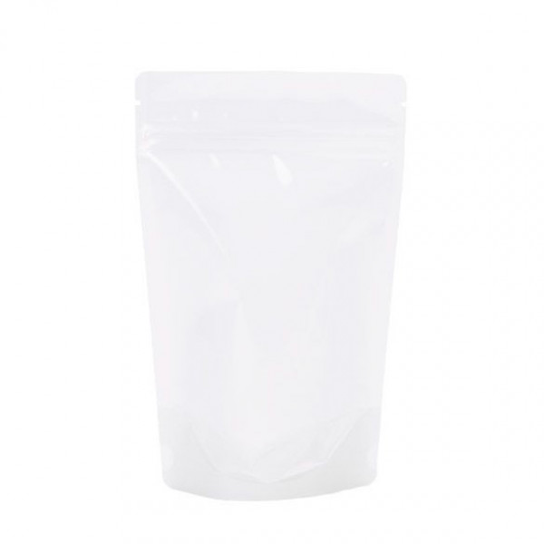 Your products are sure to stand out with the distinctive look of our white rice paper stand up pouches. ZBGR3WC measures 130 x 79 x 206 mm with inner dimensions of 121 x 64 x 171 mm.  A clear front panel gives a full view of your product, while an airtight zipper closure keeps your contents fresh. This pouch holds about 4oz/113g and is ideal for dry goods. Products like candy, nuts, and powdered mixes are a great fit for this unique pouch. Laminated for extra strength and durability, the material is 125 micron thick and food safe. When filled with product, this pouch stands up on its own, making it visually appealing on store shelves. The attractive rice paper offers a unique fiber pattern for a textured, high-end look.