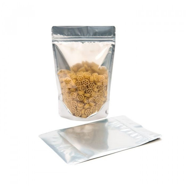 Customers are attracted to Stand Up Zipper Pouches. Our ZBGB1 pouches are no exception. These 80 x 50 x 130mm bags feature a black back with clear front panel and a silver interior. These pouches hold 1 ounce/28 grams of dry goods (based on whole coffee beans). With a usable space of 70 x 45 x 95mm, they are the perfect size for single servings of coffee, tea, vitamins, powdered mixes, nuts, and more. Smooth black finish provides a high-end look, and make an impressive sample pack. The resealable zipper and high barrier construction keep your contents fresh, while the self-supporting pouch looks good on retail shelves. These food safe pouches include tear notches which allow convenient access to products when heat sealed.