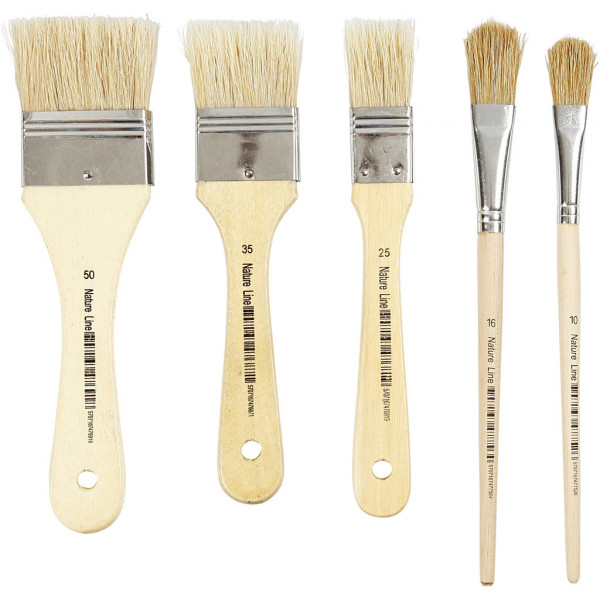 An assortment of excellent flat varnish brushes with bright hog bristles and short wooden handle, pack of 2 pcs in 5 assorted sizes.
