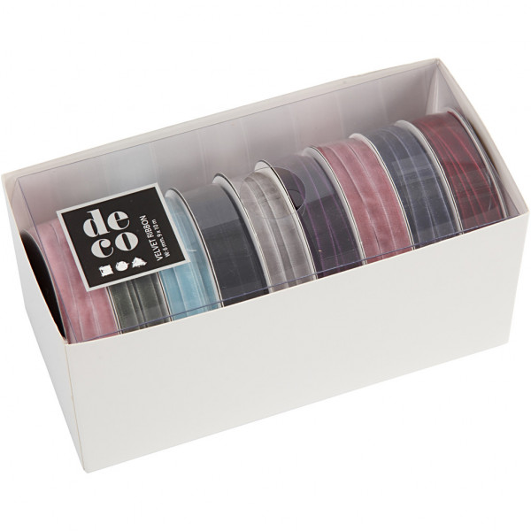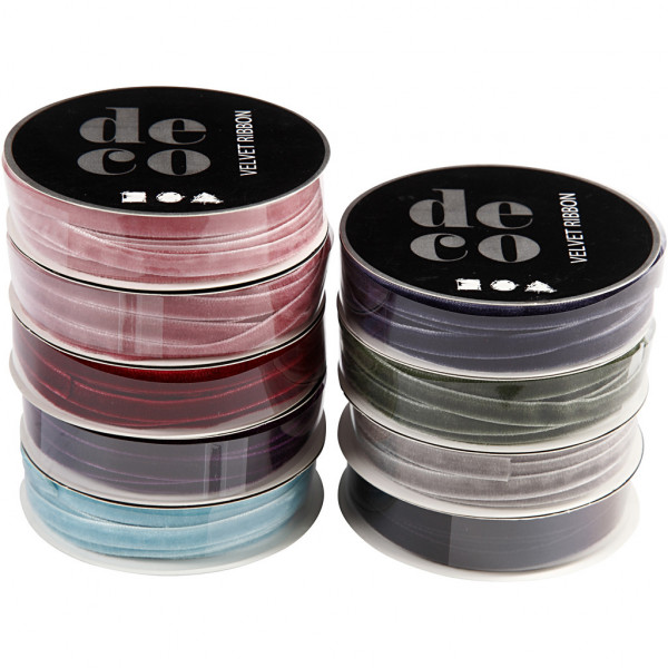An assortment of soft velvet ribbon in 9 different colours woven of dyed polyamide.
