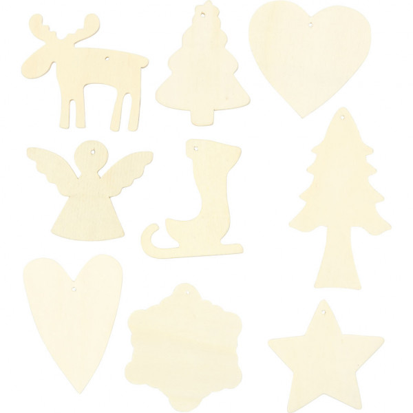 Wooden ornaments with a jute string for hanging. Supplied in a display box.